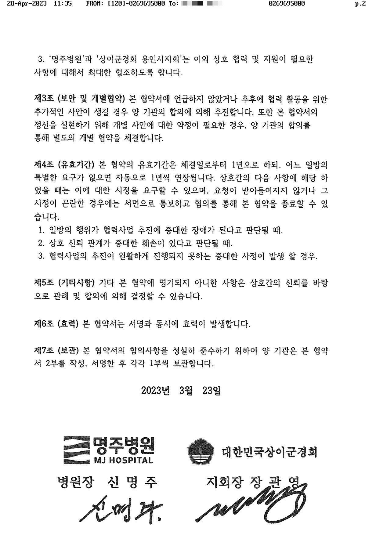 용인 명주병원, 상이군경회 용인시지회와 건강주치의 지정병원 협약 체결
