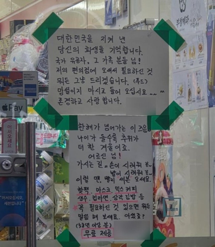 게시물에 첨부된 사진을 보면 편의점 점주가 쓴 안내문이 붙어 있다. 안내문에는 “대한민국을 지켜 낸 당신의 희생을 기억한다”며 “국가유공자와 그 가족분들은, 저희 편의점에 오셔서 필요하신 것 무엇이든 그냥 드리겠다”는 내용이 쓰여 있다. 이어 “망설이지 말고 들어오십시오. 존경하고 사랑합니다”라는 문구로 마무리돼 있었다.