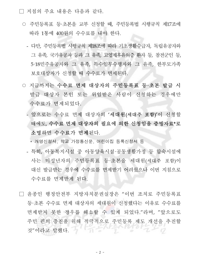 - 특히, 아동복지시설 중 아동양육시설·공동생활가정 등 합숙시설에 사는 미성년자의 주민등록표 등·초본을 세대원(세대주 포함)이 대신 발급받는 경우에 수수료를 면제받기 어려웠으나 이번 지침으로 수수료를 면제받게 된다.
