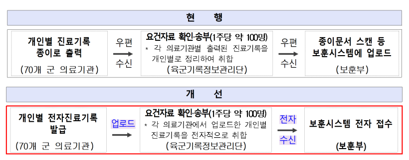 그동안 군 진료기록 등은 보안 문제 등으로 전자화가 되지 않고 군 전용망과 정부 행정망(보훈부)도 분리되어 있었다. 이로 인해 종이 문서로 출력해 우편으로 송부하는 방식에 의존할 수밖에 없어 심사 절차가 지체되고 장병들의 불편도 가중됐다.