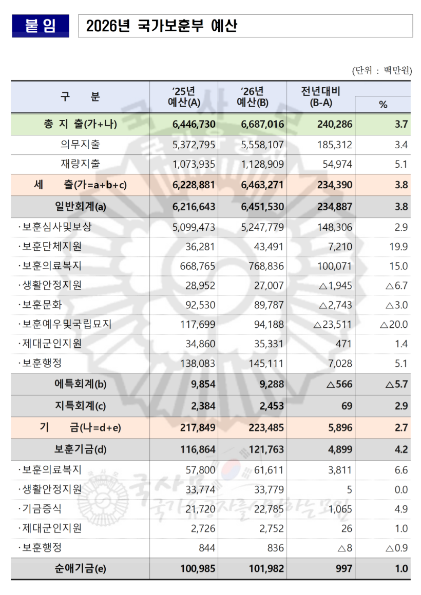 [보훈부] 2026년도 국가보훈부 예산 6조 6,870억원 확정, 보훈보상금 5% 인상