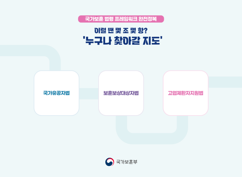 국가보훈부(장관 권오을)는 국가유공자 등 적용대상에서부터 등록방법, 보상금 및 혜택 지원까지의 절차에 따라 관련 법령을 지도 형식으로 시각화해 빠르게 이해하고 정확하게 적용할 수 있도록 하기 위한 「이럴 땐 몇 조 몇 항? ‘누구나 찾아갈 지도’」서비스를 14일(금) 누리집(알림창)에 공개했다고 밝혔다.