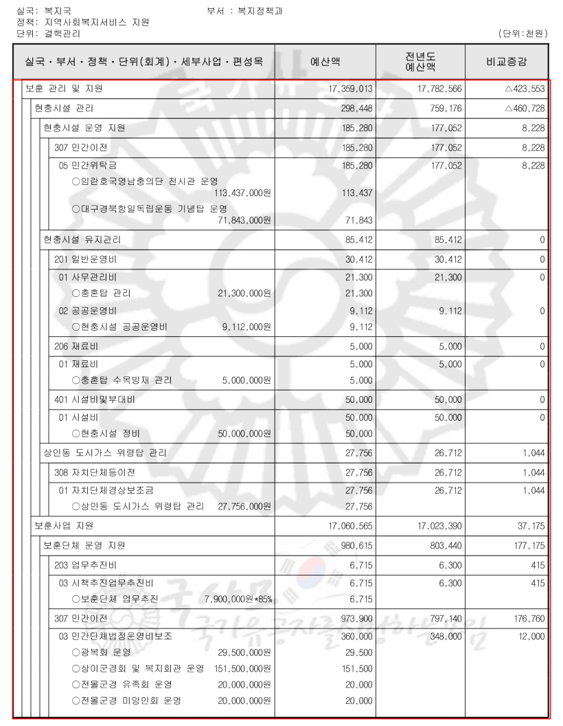 [2022년] 대구광역시 보훈명예수당, 참전명예수당, 보훈단체등 보훈대상자 지원현황