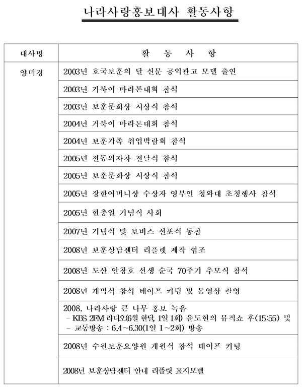 보훈가족인 광고기획자 이미연씨는 " 문건을 보면 양미경씨의 전화통화연결음 녹음, 청와대 예방등의 관변활동에 그치고 있는것은 기타 부처와 다르지 않으며 국가를 위해 희생하신 보훈대상자들을 위한 적극적인 활동이 없는것이 아쉽다. " 며 " 너무나도 비효율적인 활동사항은 실망을 떠나 절망적이다.