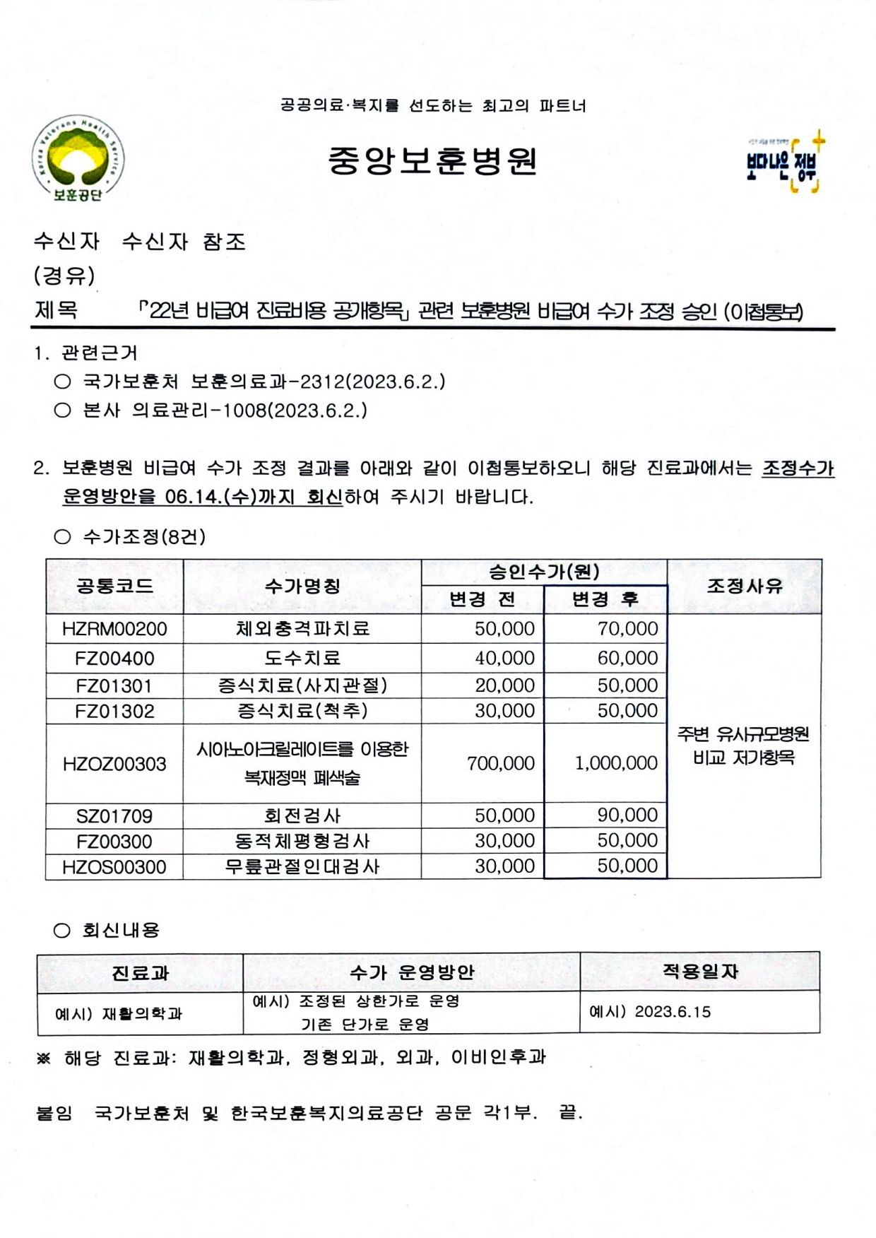 중앙보훈병원, 비급여 수가가 바뀌었다는 공지가 붙어있네요