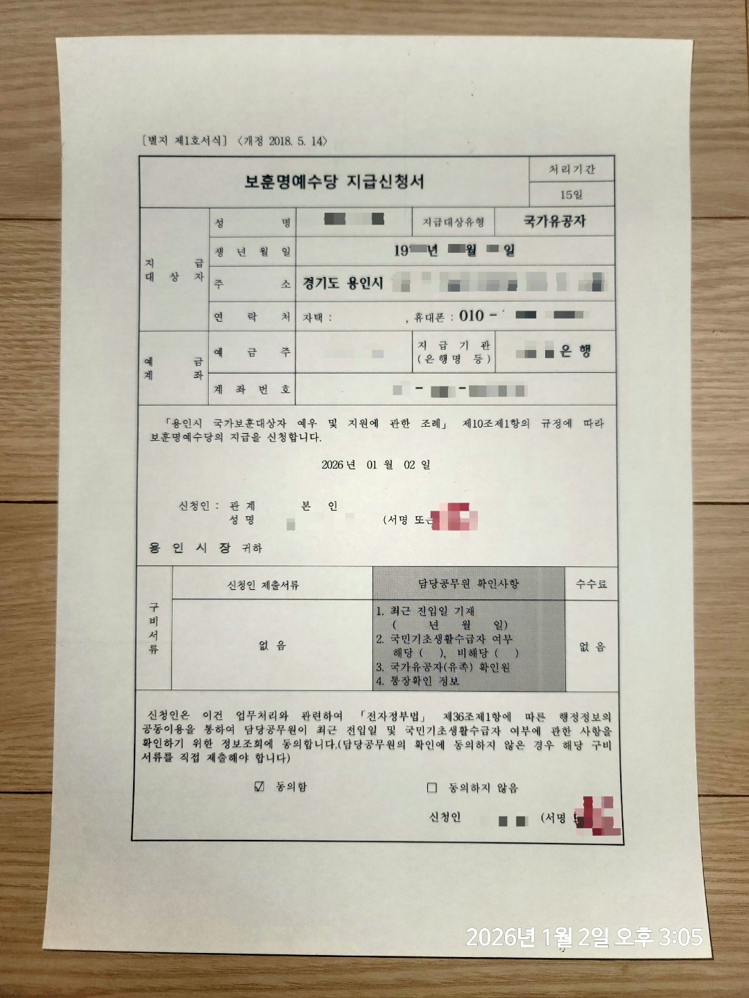 팔이 불편해 펜으로 자필 글 작성이 힘들어서 이곳에도 본인이 등록해두었지만, 국가법령정보센터에서 내려받은 양식 파일을 열어서 인적사항 입력 후 인쇄해 인감도장 날인 후 행정복지센터에 접수했는데, 인쇄 후 날인한 건지, 도장도 인쇄된 건지 확인하고, 혹시 몰라서 복사해 둔 통장사본 및 국가보훈등록증(국가유공자증) 사본을 본 직원이 요청해서 제출했죠.