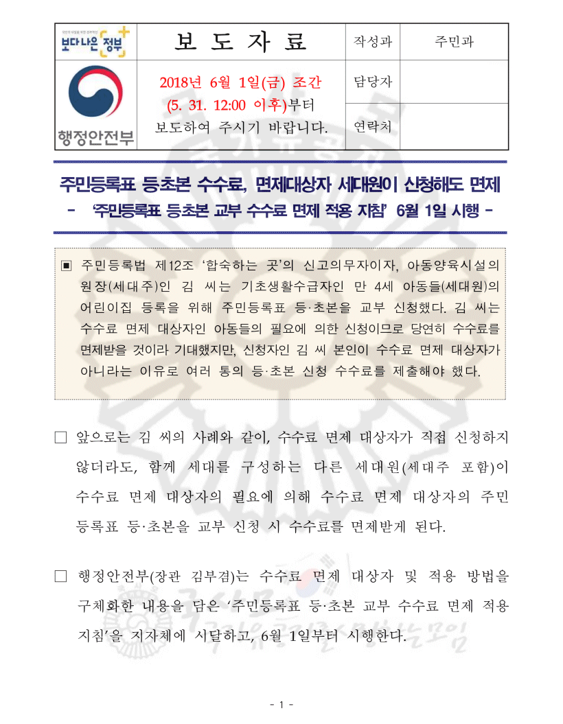 □ 행정안전부(장관 김부겸)는 수수료 면제 대상자 및 적용 방법을 구체화한 내용을 담은 ‘주민등록표 등·초본 교부 수수료 면제 적용 지침’을 지자체에 시달하고, 6월 1일부터 시행한다.