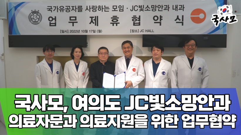 □ 국사모는 “10월 17일(월) 오후, 서울 여의도 JC빛소망안과 대회의실(6층)에서 노용환 국사모 대표와 최경배 JC빛소망안과 원장과 소속 의료진, 직원등이 참석한 가운데 ‘국가유공자 의료지원 및 의료자문’을 위한 업무협약을 체결한다”고 17일 밝혔다.