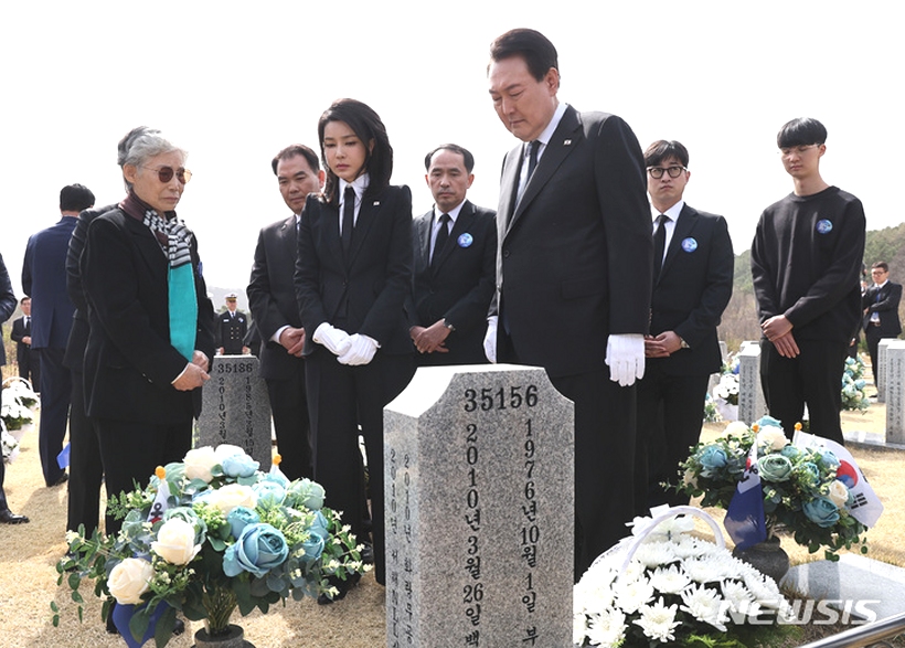 윤석열 대통령과 부인 김건희 여사가 24일 대전 유성구 국립대전현충원에서 열린 제8회 서해수호의 날 기념식에 앞서 천안함 46용사 묘역을 찾아 참배한 뒤 고 민평기 상사 묘비를 살펴보고 있다.