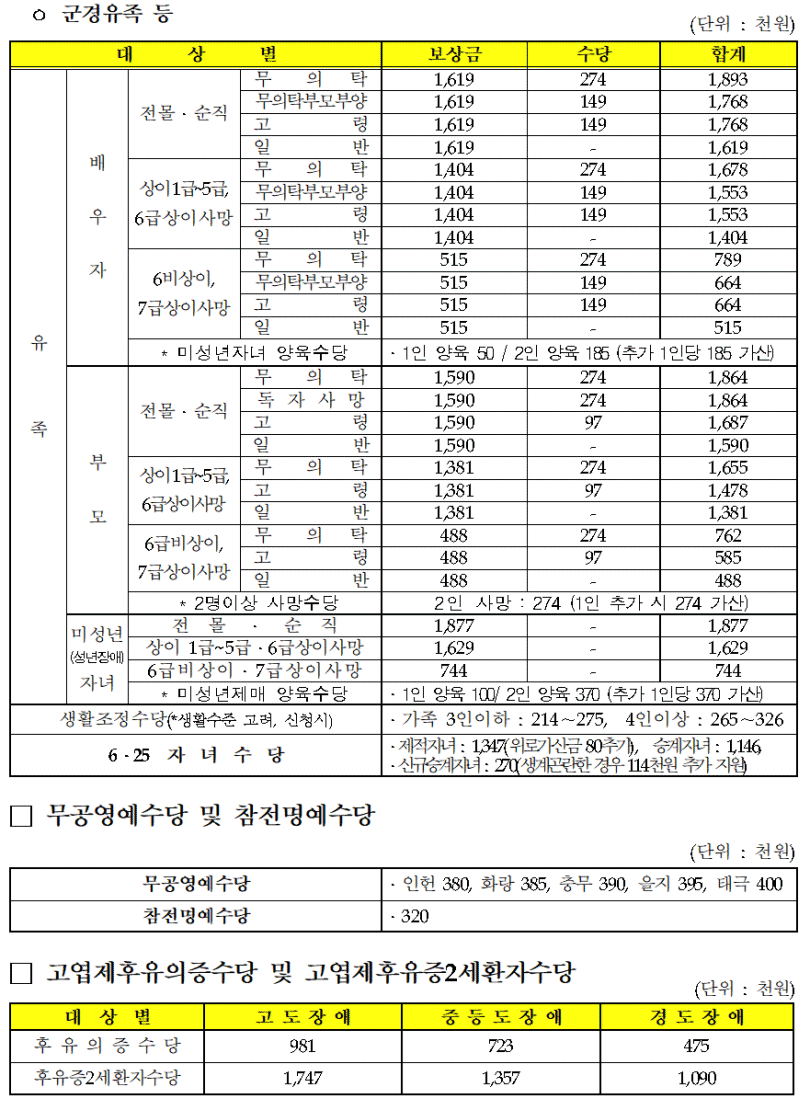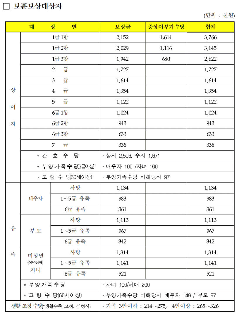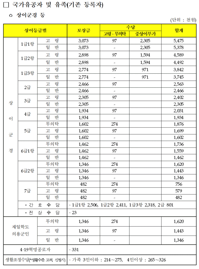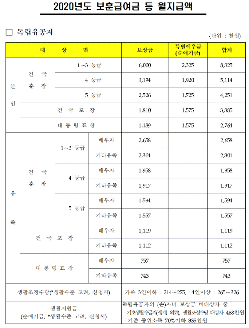 2020년 국가유공자 보훈대상자 보훈보상금 (보훈급여금 보훈연금) 월지급액표